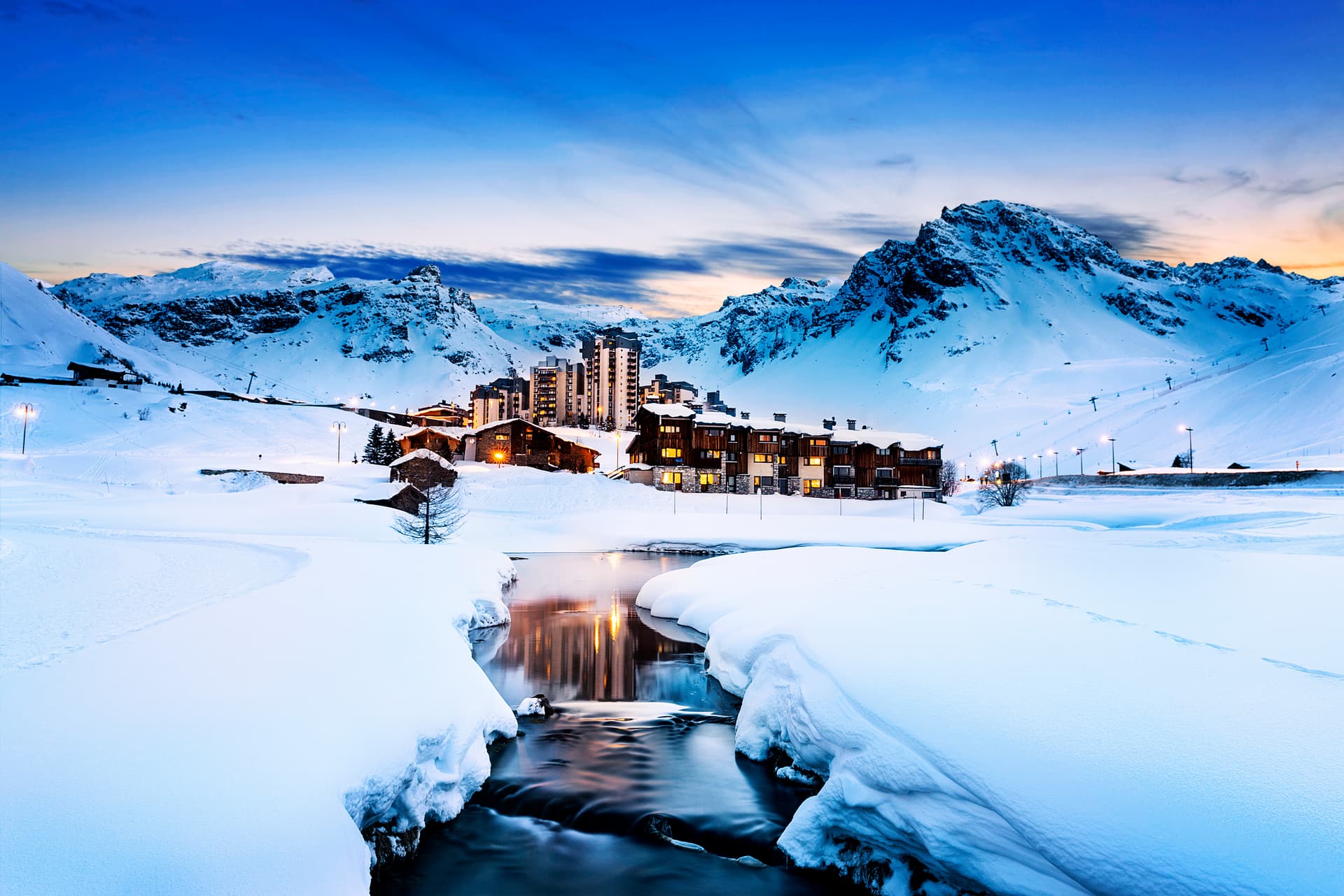 Val D'Isere ski resort at dusk with lights on